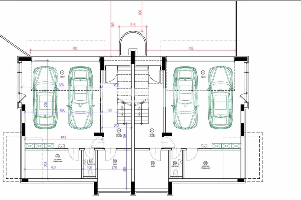 Партерно ниво - гараж за два автомобила и паркоместа пред гаражите, котелно помещение с монтиран газов котел.