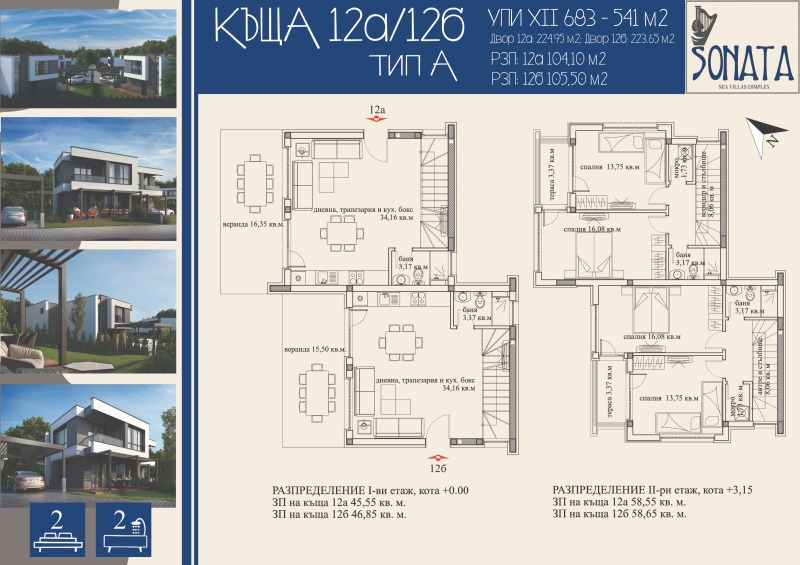 SONATA Sea Villas се състои от 24 броя еднофамилни къщи със самостоятелни парцели и контролиран достъп. Къщите са разположени на терен с обща площ от 8611 кв.м., в който са разпределени 20 броя УПИ и вътрешна улица. Парцелите са с площ от 300 кв.м. до 573 кв.м. Предлагат се три типа къщи, тип А, тип Б и тип В, всяка от които на два етажа, с две или с три спални. Разгънатите застроени площи са съответно от 104,10 кв.м., 127,11кв. и 151,12 кв.м. Всяка къща се придобива заедно със съответния самостоятелен парцел. Къщите тип А представляват две къщи разположени в едно УПИ, на сключено застрояване, къщата се придобива с 1/2 идеална част от парцела. В парцела на всяка къща има предвидено паркомясто и се обособява двор с площ от 222 кв.м. до 364 кв.м.
