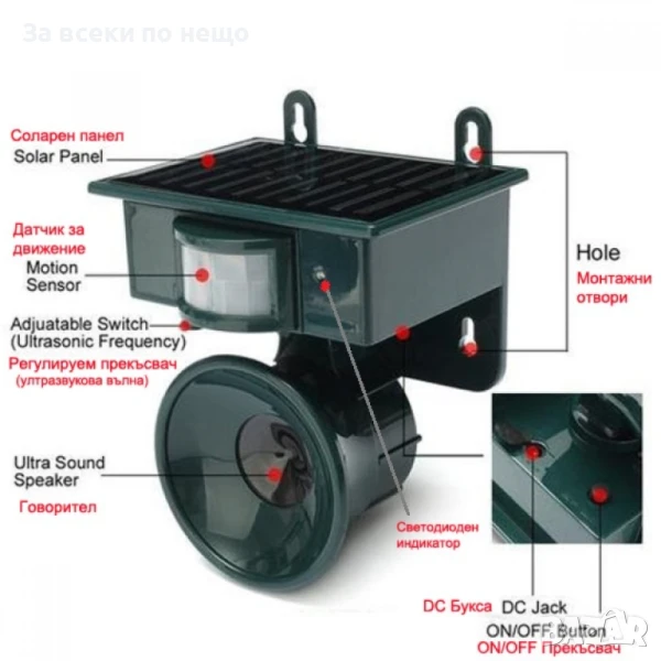 Соларен уред с ултразвук и сензор за прогонване на птици, кучета, котки, лисици, мишки и други животни.