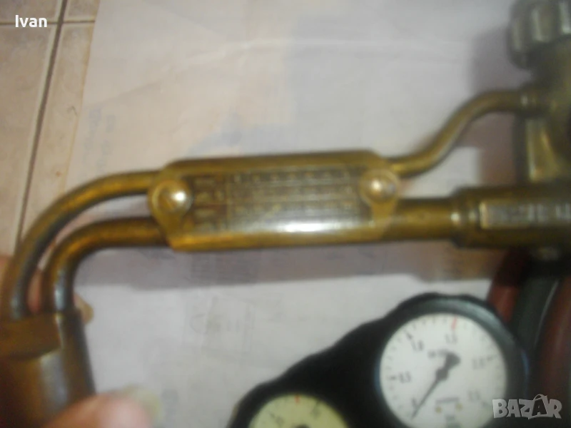 ОПИСАНИЕ на ОКСИЖЕН КОМПЛЕКТ оригинален резак с маркучи, с редуцир вентили и с искрогасители . Професиионален комплект. Марка и модел на резака горелка - MESSER GRIESHEIM Дължина на резака 44 см. Отлично състояние. Алуминиева дръжка 22 см, 2 крана, рамо на резак двутръб бронз 20 см, и поставена контактна дюза медна с множество дупки за пламък за точково нагряване. Маркучи - 2 броя всеки по 7,5 м. дължина. Дължина с редуцир вентилити е иискрогасителити - всеки маркуч по 8 м. Поставен 1 искрогасител за ацетилен оригинален на Rotnenberger. Налични към комплекта 2 оригинални редуцир вентила. Описание на синия вентил за кислород.