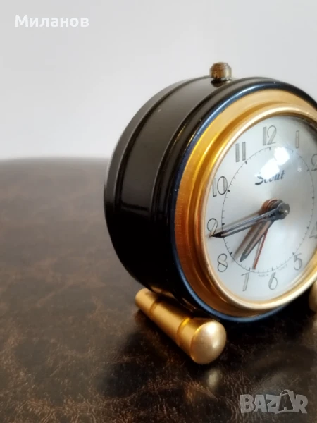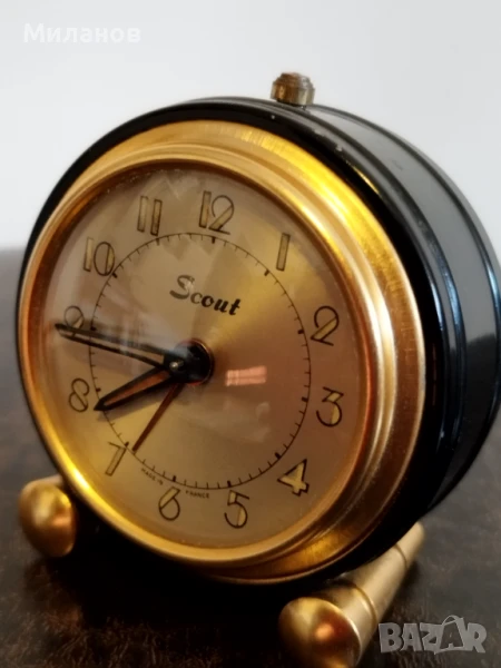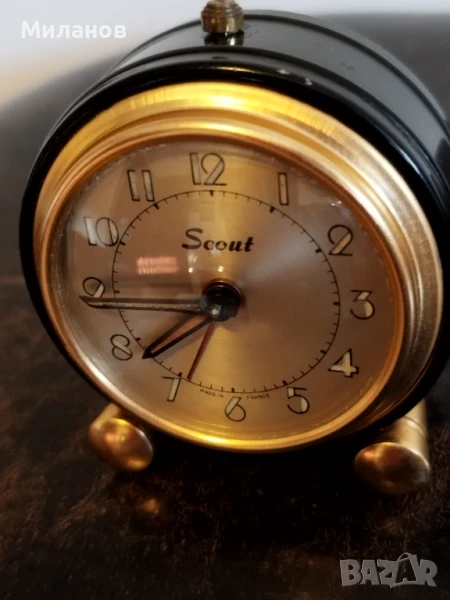 Стар механичен френски малък будилник Scout, отремонтиран и обслужен.Работи и звъни.Диаметър-65 милиметра.Номер на часовника-660319