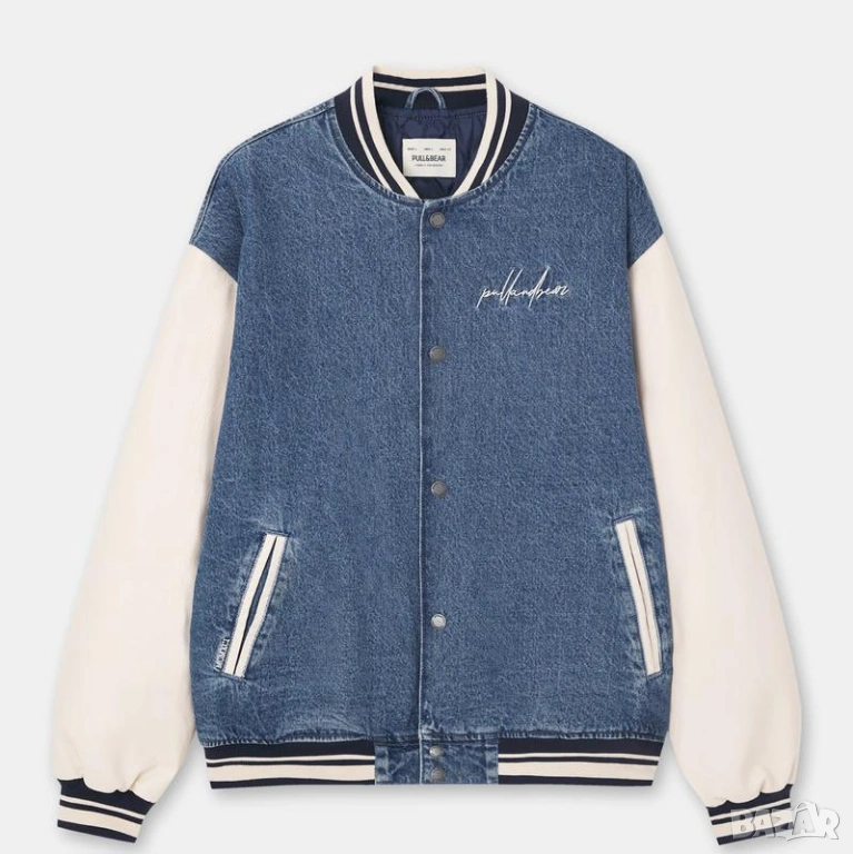 Мъжко пилотско яке от деним с ръкави от еко кожа Pull&Bear, XL, снимка 1 - Якета - 51110015 Мъжко пилотско яке от деним с ръкави от еко кожа Pull&Bear, XL, снимка 2 - Якета - 51110015 1/2