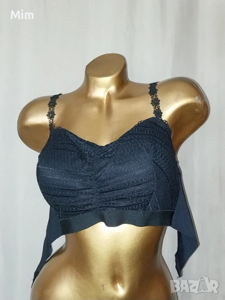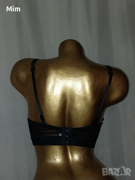 Дантелен черен сутиен с допълнителен колан отпред който се закопчава триредово с телени закопчалки за повдигане на бюста, с дунапренена подплънка която може да се маха без банели, регулируеми презрамки закопчаването е отзад триредово с телени закопчалки подгръдна от 80 до 100 см еластичност. Няма следи от употреба.
