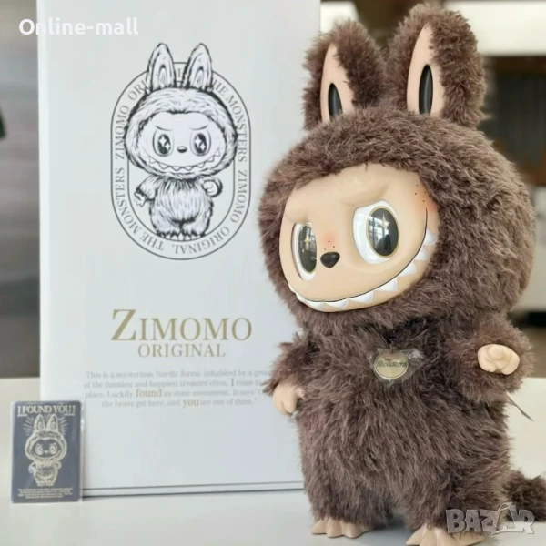Labubu Zimomo, Лабубу Зимомо, голямо Labubu, Labubu 38см, Labubu 58см, плюшена играчка Labubu, колекционерско Labubu, Labubu бяло, Labubu кафяво, лимитирана серия Labubu, Labubu the Monsters, Labubu плюшено, Labubu Zimomo голям размер