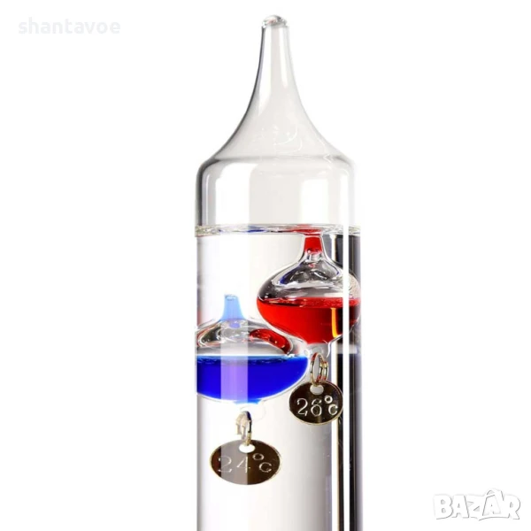 Термометърът представлява прозрачен стъклен цилиндър с височина от 28 см и 5 стъклени сфери, пълни с течност.
