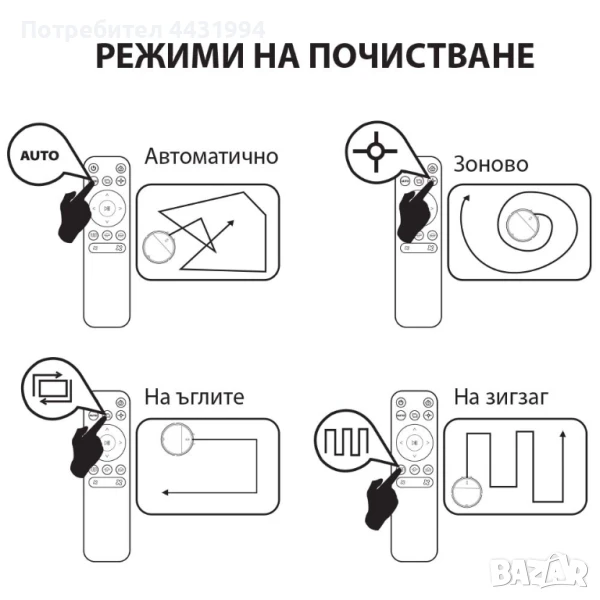 Дистанционно: 1: Автоматично почистване 2: Почистване по ъглите 3: Почистване на зона 4: Почистване на зигзаг 5: Ръчно управление 6: Регулиране на употребяваната вода в две нива