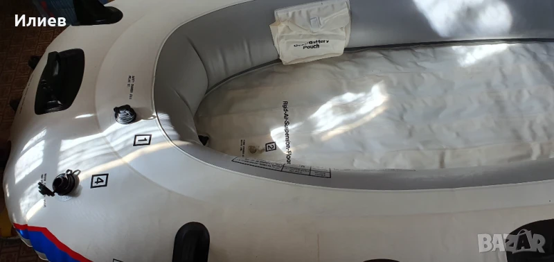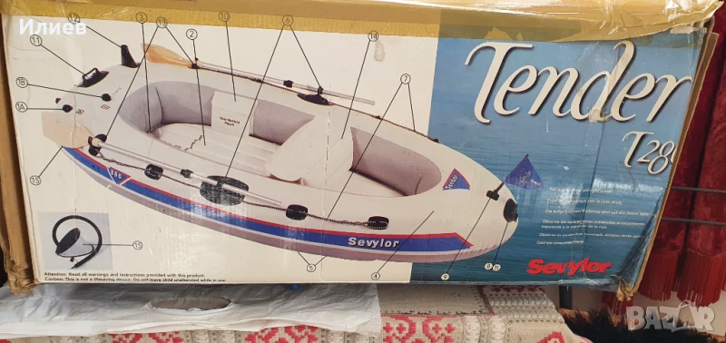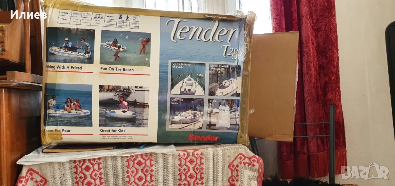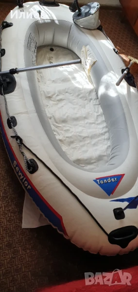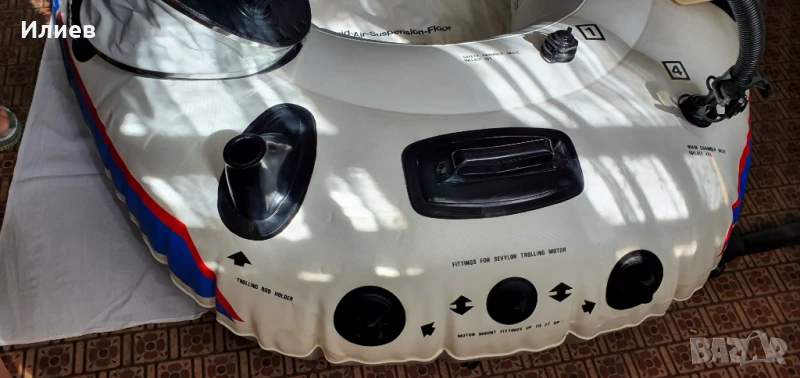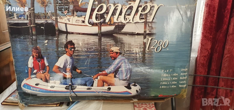 Надуваема лодка с възможност за мотор, окомплектована с помпа и гребла. Дэлжина 2,80 м щшрочина 1,40 м, тегло 12 кг. Мотериалът е поливинилхлорид. Подхждащият бипзинов мотор е 3 к.с. електрическия 12 волтова батерия. Джпустимия товар 250 кг. Ива две незначителни интервенции, които са старателно и надеждно отстранени с оригинален материал.
