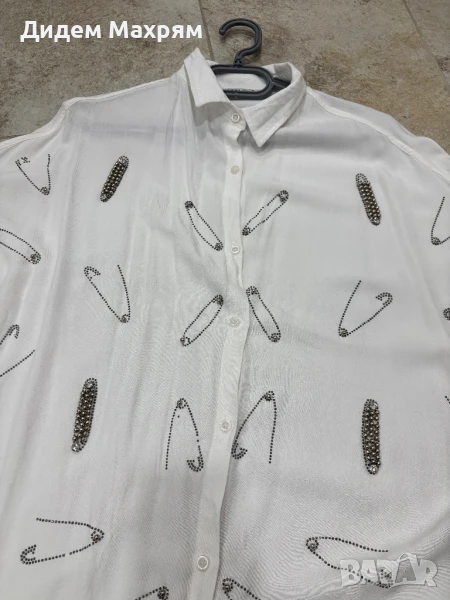 Стилна и различна риза в бяло със свободна (оувърсайз) кройка. Декорирана с метални капси във формата на безопасни игли – ефектен акцент, който веднага привлича вниманието. Подходяща за по-голяма гръдна обиколка – стои удобно и елегантно.