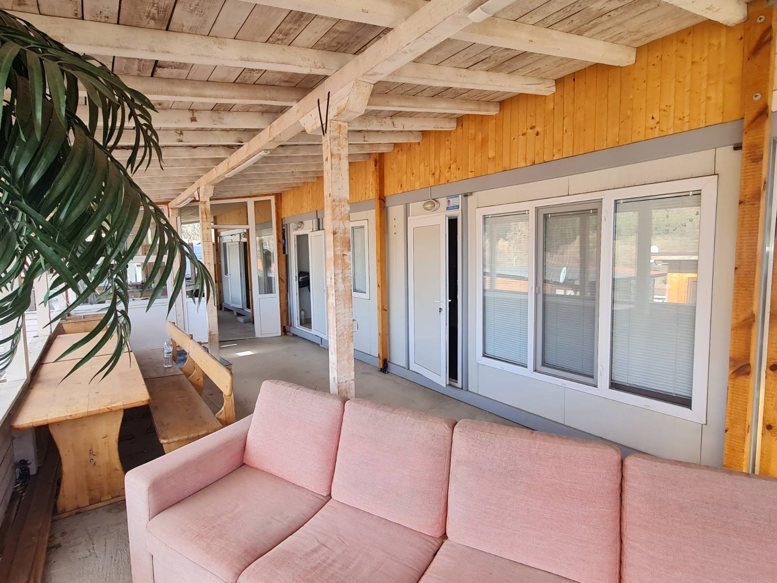 Имотът се състои от два жилищни контейнера (всеки с размери 2,4 м х 6 м) и отделен санитарен контейнер с размер 2,4 м х 1,5 м. Построен е масивен дървен навес с площ от 164 кв.м, като половината от него е затворен с алуминиева дограма и има изолация. В тази част е обособена кухня с трапезария и балкон. Останалата част под навеса е открита оборудвана с голям ъглов диван и люлка, идеална за отдих на открито.