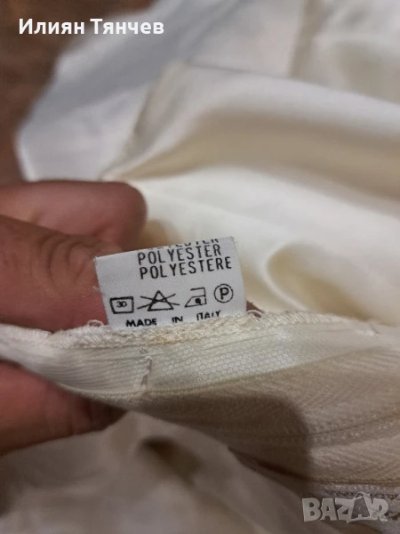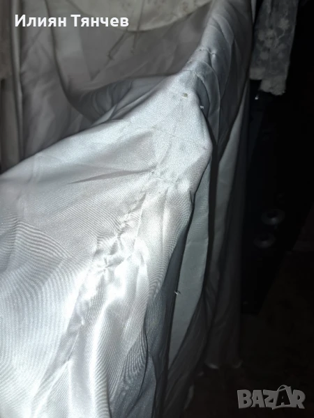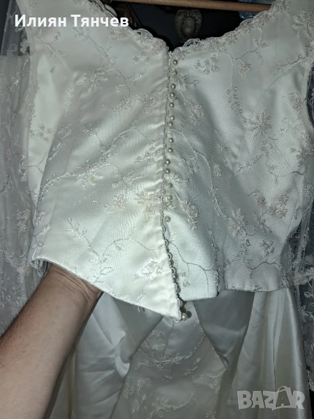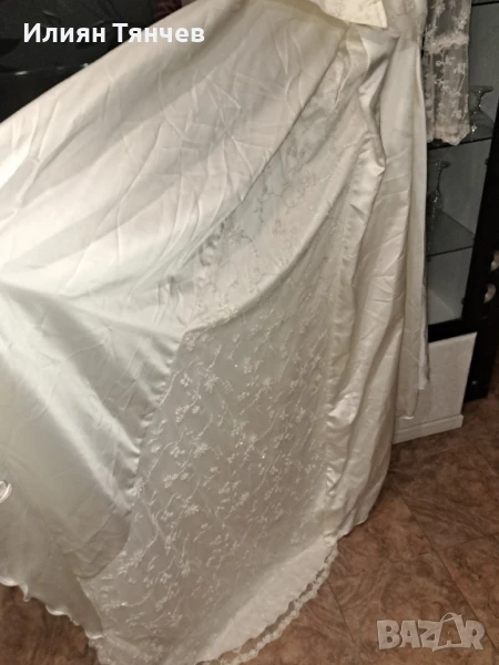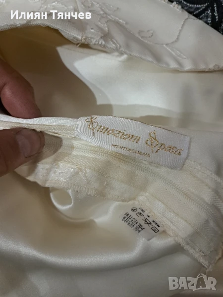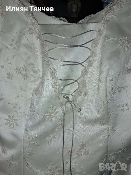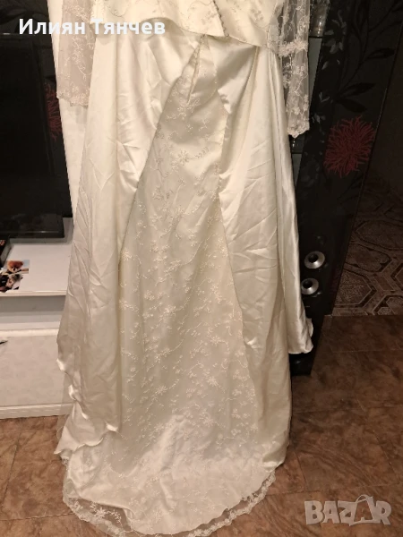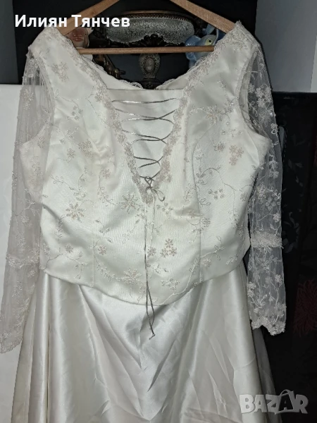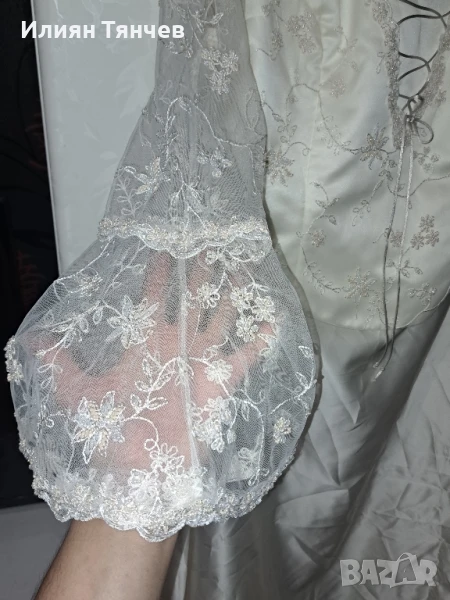 сватбена булчинска булченска рокля екрю голям размер На 10снимка се вижда едно набрано място, имаше зашити 2 мъниста но паднаха и плата остана набран. Дълъг красив шлейф, дантелени ръкави. отзад е с цип и декоративни копченца. Състои се от 2 части-пола и бюстие. бюстието е с декоративно въженце.
