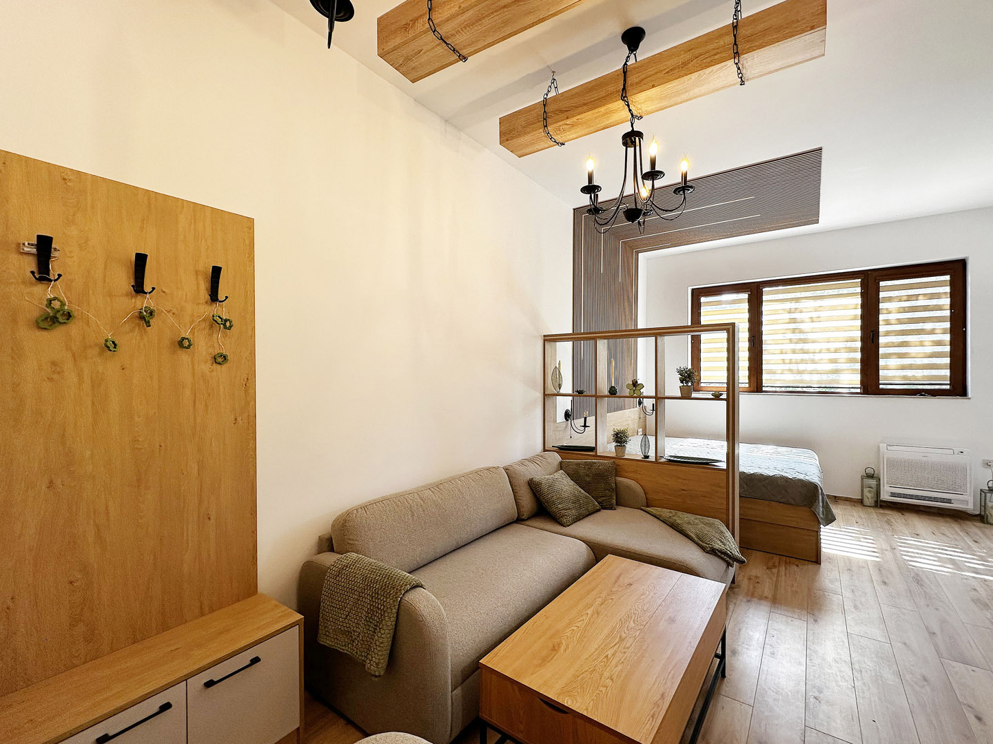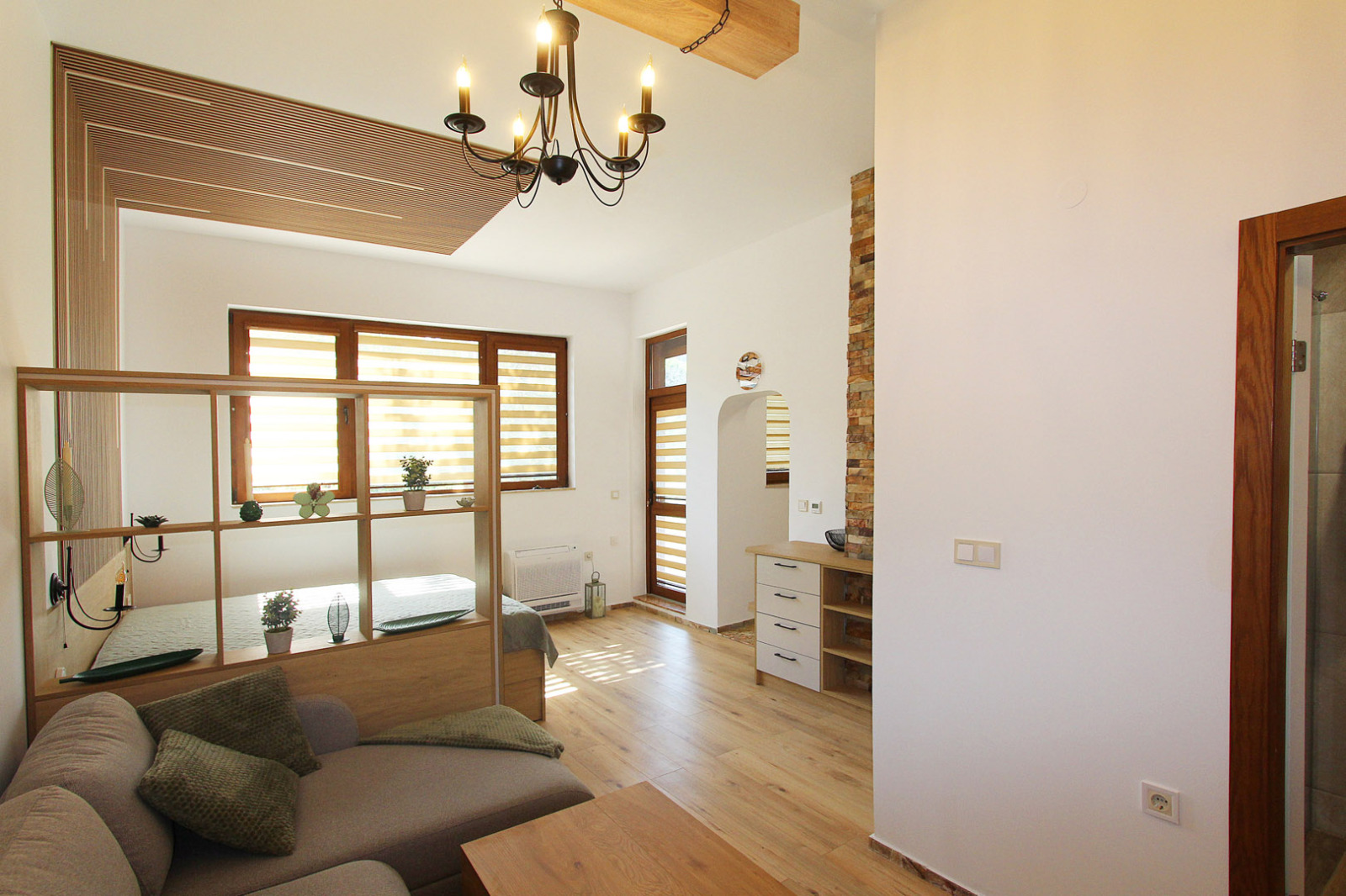 Имота се намира на първи етаж и е с източно изложение.В него се влиза дирекно. Всекидневната разполага с нова мека мебел, холна маса, голямо двойно легло, напълно оборудвана кухня. От нея се излиза на тераса, която е с източно изложение. Кухненския кът е отделен и е обзаведен с нови уреди и шкафове. Има вградена пералня със сушилня.