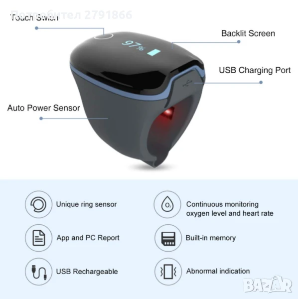- Дълъг живот на батерията: О2-ринговият оксиметър е презареждаем и осигурява 12-16 часа непрекъсната работа с едно зареждане.
