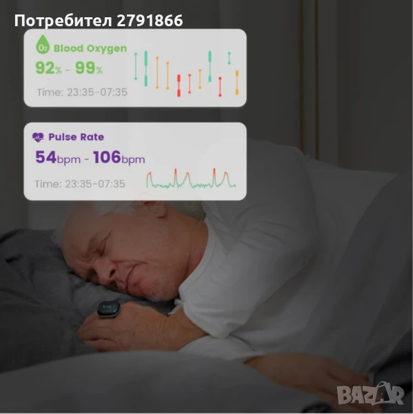 - Непрекъснато нощно измерване - Веднага щом носите O2 пулсовия оксиметър, той автоматично започва постоянно да следи нощната ви кислородна сатурация в кръвта, сърдечната честота и движенията на тялото.