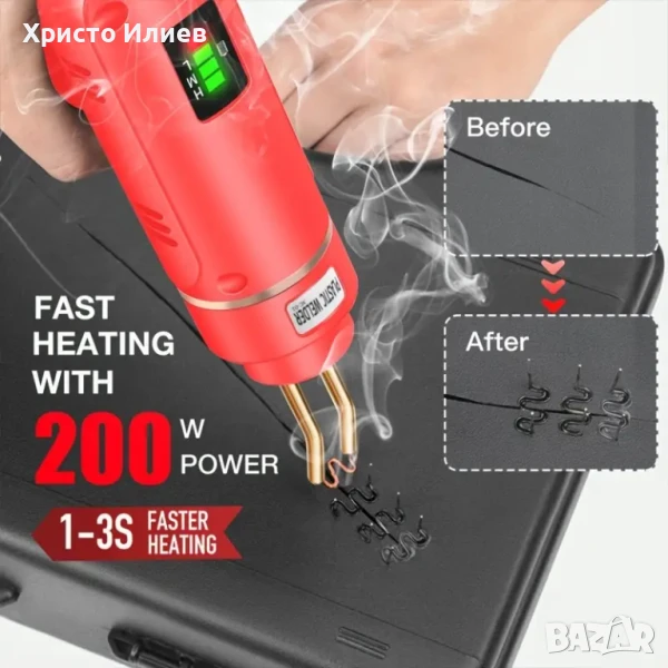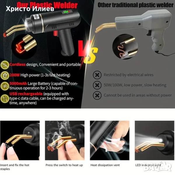 поялникът за лепене на пластмаса е един необходим уред на всеки от Вас, който обича да се занимава с поправка и ремонт на ежедневни пластмасови принадлежности, укрепване на пластмасови части на всички модели автомобили, като държачи за крушки, брони, табла, пластмасови пръстени и други. Благодарение на този поялник за лепене на пластмаса Вие ще можете да залепите пластмасовите детайли по най- прецизния и надежден начин. Притежава още специално проектирана температурна регулация, чрез която да контролирате топлината за точни резултати,