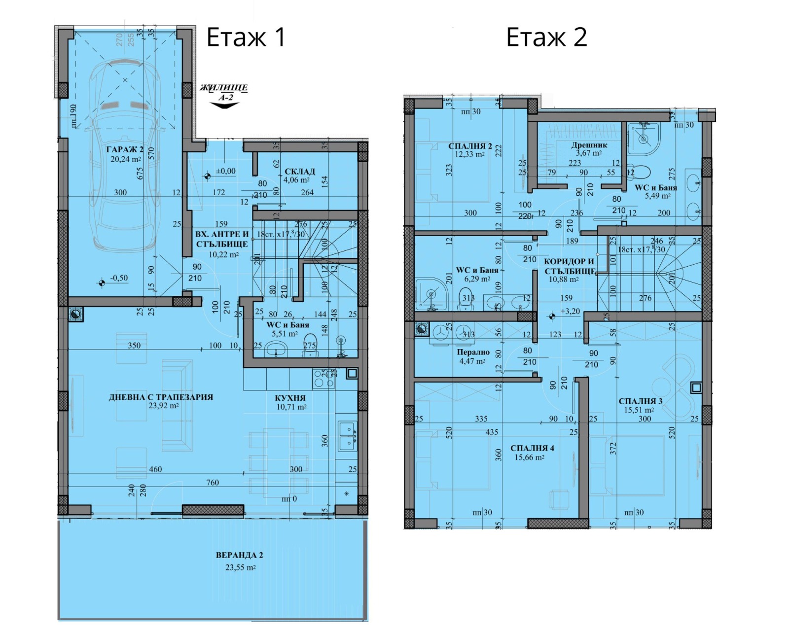 Етаж 2 - 3 спални, дрешник, 2 бани с тоалетна, перално помещение.