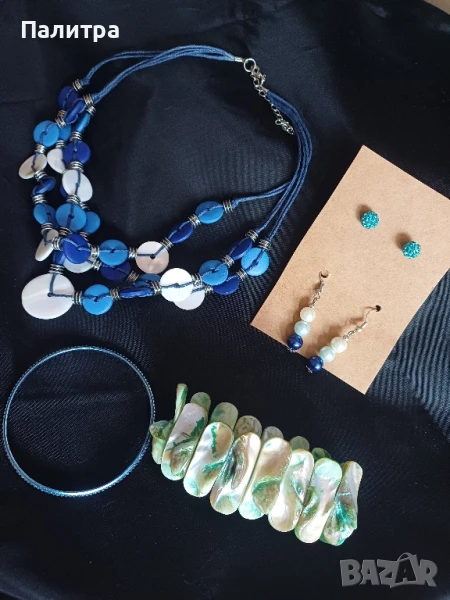 Лот дамски бижута 1 бр.гривна метална 1 бр.колие сини елементи 1 бр. гривна от черупки на сладководна мида 2 бр.обеци