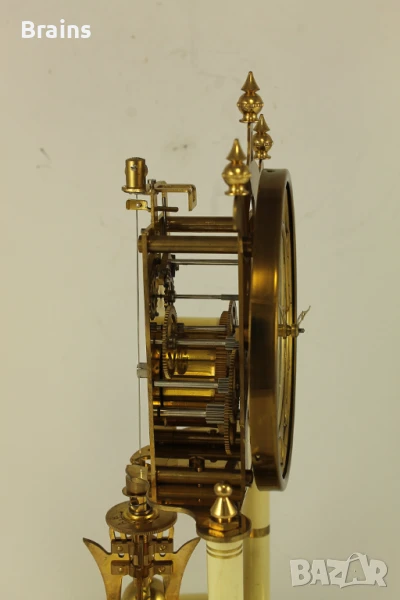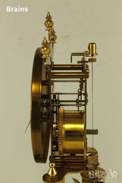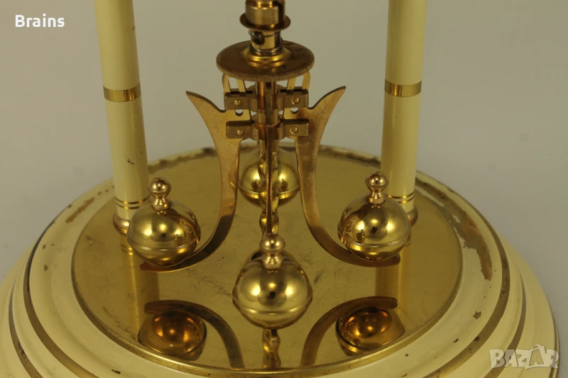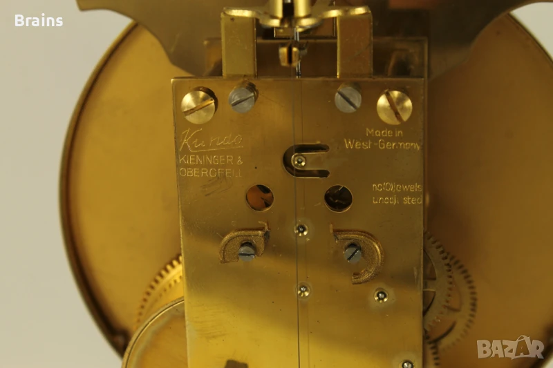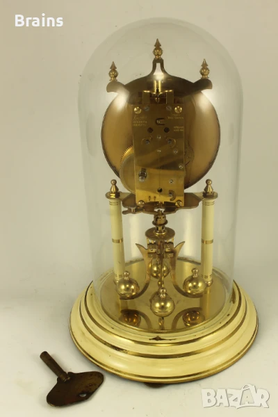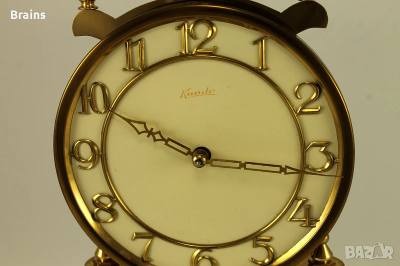 Стар Немски механичен часовник KUNDO 400 дневен от 1950-те години. Часовника е в отлично работещо състояние, работи точно. Към него има бронзово ключе за навиване на пружината. Със оригиналният стъклен похлупак. Похлупакът е без забележки. Единсвената забележка е леко ожулване на боята долу при основата, може да се пребоядише.
