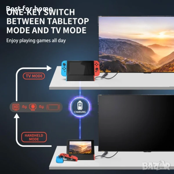 Замяна на докинг станция за телевизор с многопортов превключвател: Док станцията за превключване е специално проектирана да замени оригиналния докинг превключвател и OLED модел, с HDMI порт, порт за зареждане Type-C и 2 USB 2.0 порта. Зареждащата докинг станция за превключване поддържа 4K/1080P HD видео изход, вход за контролер на превключвателя или други USB устройства.