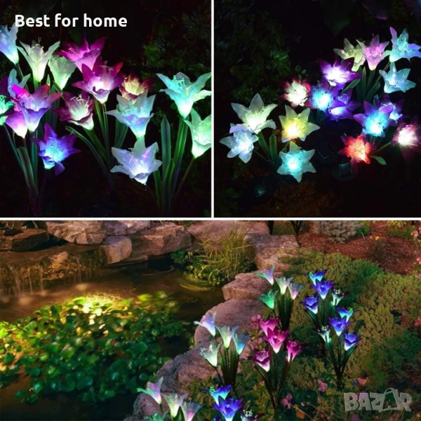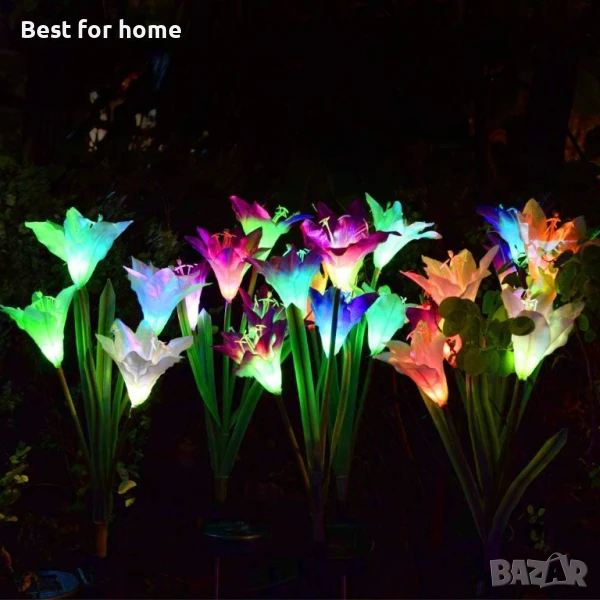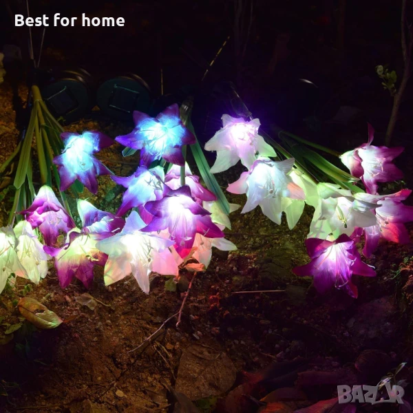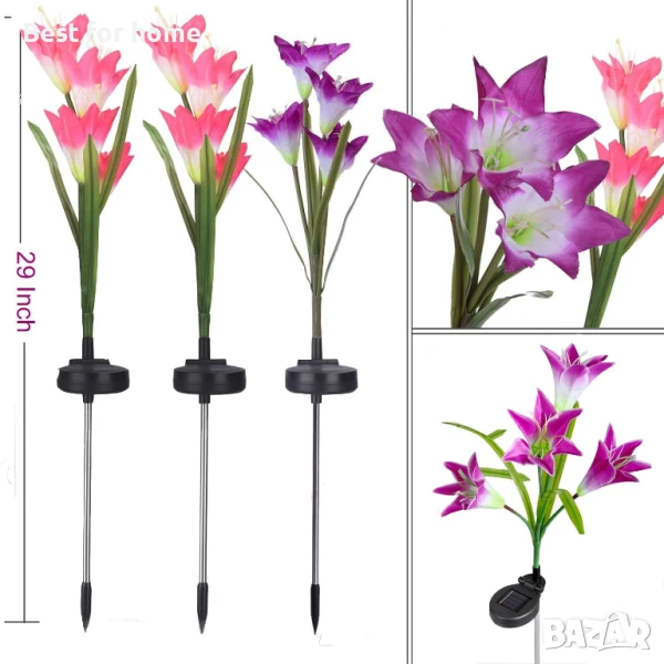 Соларни лампи с цветни лилии 2021: Тези външни соларни градински лампи с колчета имат по-големи цветове на лилия, които са изработени от питомна материя, подобрявайки качеството и външния вид на тези на истинска лилия. Водоустойчивото стъкло е IP65, цветето и стъблото са изработени от висококачествен материал, доказано устойчив на лошо време.