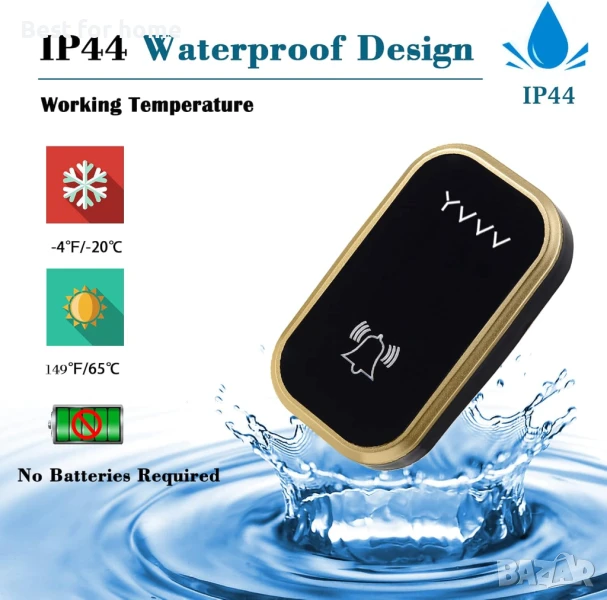 Не е необходима батерия: Когато безжичният звънец натисне съответния бутон, предавателят автоматично генерира захранване и изпраща стабилен сигнал към приемника. Решава проблема със смяната на батериите и ви спестява поне 10 евро годишно от разходи за батерии.
