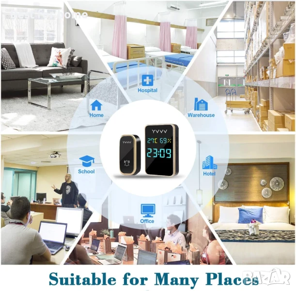 【Монитор за температура, влажност и време】 Самозахранващият се звънец е оборудван със сензор за температура и влажност, способен да отчита промените в околната среда около сензора в реално време. Функцията за напомняне за време ви позволява да не пропускате нито един важен момент и да увеличите щастието в живота.