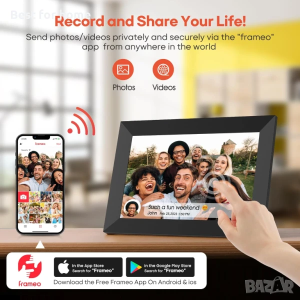 【Абсолютна поверителност и сигурност】Frameo е професионално приложение за управление на снимки, създадено в Дания, с абсолютна поверителност и сигурност. Освен потребителите, които сте добавили, никой няма достъп до вашата цифрова фоторамка, така че не е нужно да се притеснявате за изтичане на снимки. Frameo има потребители в повече от 25 страни/региона по света и е най-популярният софтуер за албуми. Цифровата фоторамка BIGASUO е оторизирана от компанията Frameo App. Абсолютна поверителност и сигурност!
