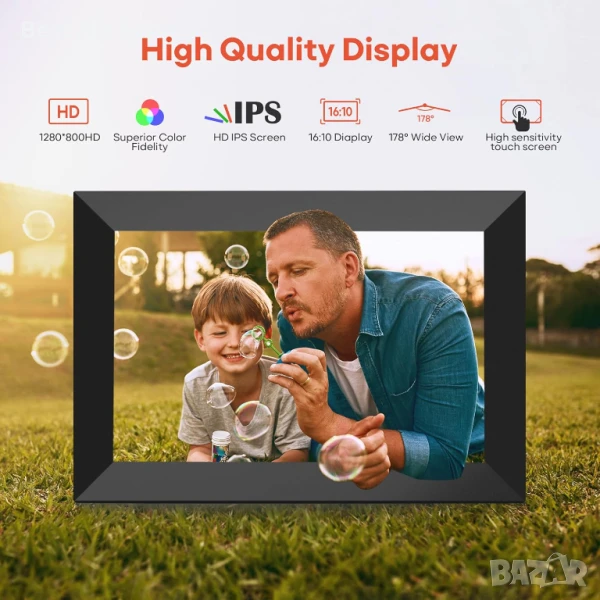【10,1-инчов IPS HD сензорен екран】10,1-инчовата WiFi цифрова фоторамка е оборудвана с висококачествен HD 1280*800 IPS сензорен екран, който ви позволява да получите прекрасна визуализация на картината от всеки ъгъл. Превъзходната цветова прецизност перфектно запазва яркостта и привлекателността на всяка ваша снимка. WiFi цифровата фоторамка Frameo поддържа формат на картина JPG/JPEG/BMP/PNG и видео формат MP4. Като електронно устройство, този продукт не е подложен на износване и няма понятие за изтичане на срока на годност.