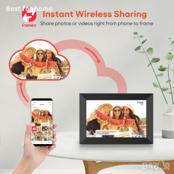 【Споделяне на снимки/видеоклипове мигновено чрез безплатното приложение "Frameo" със семейството и любимия човек】Уловете всеки момент и го споделете мигновено със семейството/любимия си човек. С цифрова фоторамка, свързана към Wi-Fi, изтеглете безплатно приложението "Frameo", което е достъпно както за мобилни телефони с Android, така и за iOS, след което можете да изпращате снимки или видеоклипове (макс. 15 секунди) към цифровата рамка от всяка точка на света. Вградената памет от 32 GB и поддръжката на Micro SD карта до 32 GB позволяват запазване на снимки (около 40 000) и малки видеоклипове.