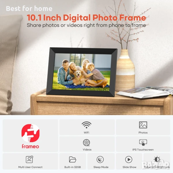Frameo 10.1-инчова WiFi цифрова фоторамка, 1280x800 HD IPS сензорен екран, електронна фоторамка, 32GB памет, автоматично завъртане, монтаж на стена, споделяне на снимки/видеоклипове мигновено чрез приложението Frameo отвсякъде.