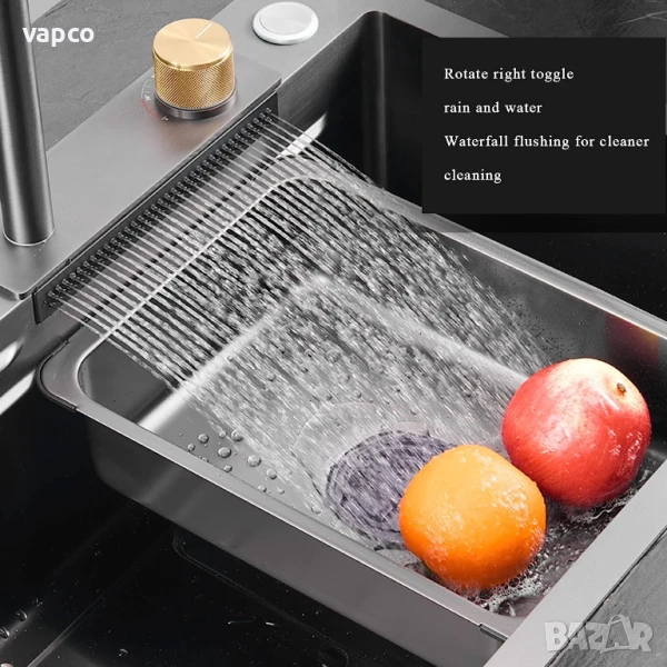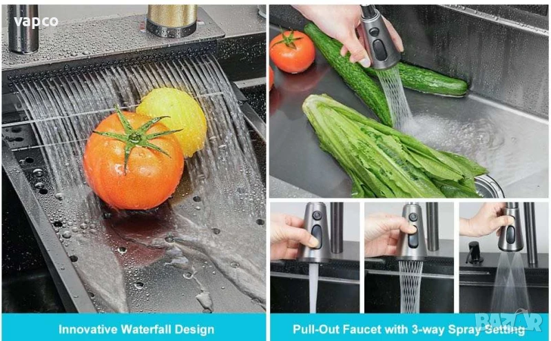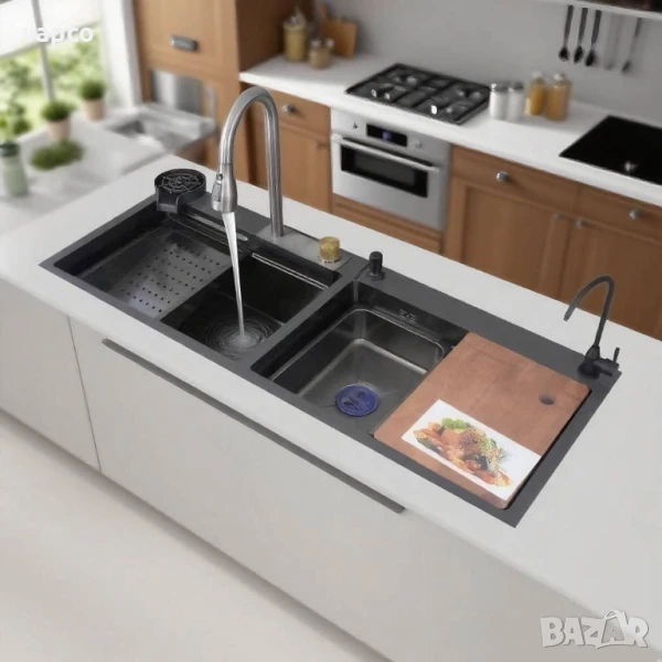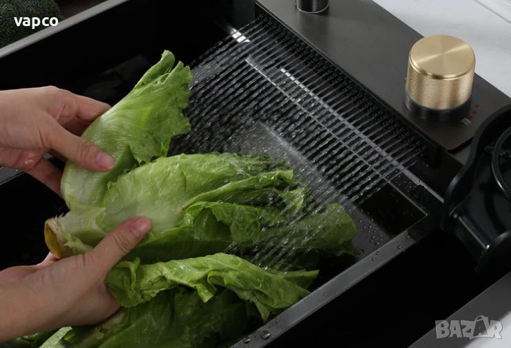 Висококачествена мултифункционална мивка от неръждаема стомана с две корита. Създава многофункционално работно пространство, за да можете удобно да миете плодове и зеленчуци с нейния уникален водопад и подходяща дренажна кошница. Единичната голяма купа осигурява достатъчно пространство за накисване и почистване на съдове за готвене, докато наклонената основа към единичния изместен дренаж минимизира натрупването на вода. Изработена е от неръждаема стомана с нано покритие, което я прави устойчива на отчупване, напукване или изгаряне, и осигурява години красота и надеждна работа.