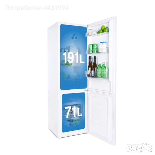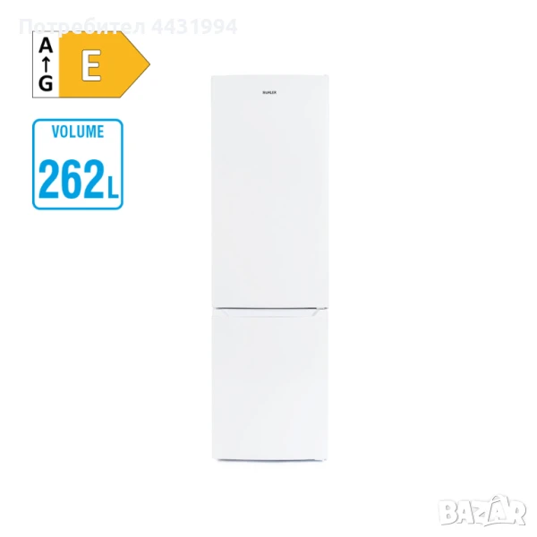 Категория: Комбинирани хладилници с фризер; Климатичен клас: N/ST; Ниво на шума: 40dB; Общ обем: 262L; Обем на хладилната част: 191L; Обем на фризера: 71L; Годишна консумация на енергия: 210kWh; Хладилен агент: R600a; Енергиен клас: E; Реверсивна врата: Да; No Frost: Не; Хладилна част: 3 стъклени полици, 1 чекмедже, 3 рафта на вратата; Фризерна част: 2 чекмеджета; Бруто тегло: 55kg; Нето тегло: 50kg; Размери на продукта (ШхВхД): 550x1800x560mm; Размери на опаковката (ШхВхД): 575x1859x595mm; Цвят: Бял; Гаранция за физически лица: 5 години;
