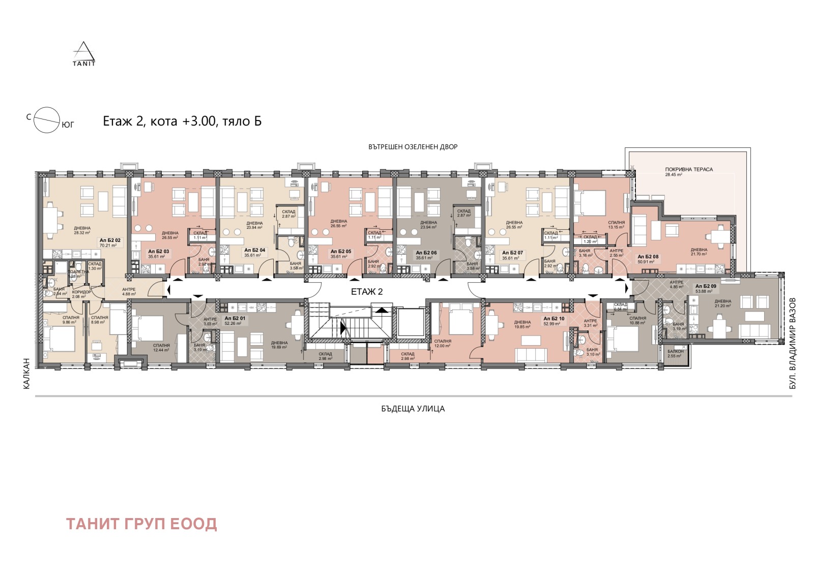 Предлагаме за продажба ап. Б2 10, двустаен, на втори жилищен етаж (кота +3,00м.) със ЗП 53 кв.м. (64кв.м. с вкл. общи части) със западно изложение в новата ни сграда Lion Hill етап 2. Цената на апартамента е 136 000 евро с вкл. ДДС. Аналогичен апартамент е свободен и на трети етаж (Б3 10), четвърти етаж (Б4 07) и пети етаж (Б5 07). В сградата все още има избор на едностайни, двустайни, тристайни, четиристайни апартаменти с различни големини и изложения, на различни етажи, както и паркоместа - разгледайте всички свободни обекти на уебсайта ни tanit.bg.