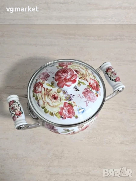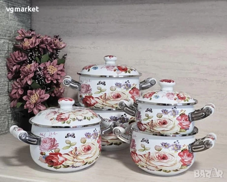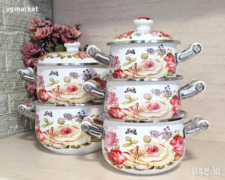Kомплект емайлирани тенджери с декор 5 бр., с керамични дръжки.