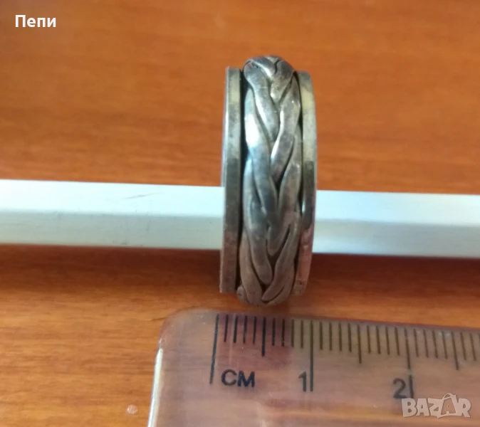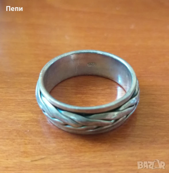 Много ефектна, масивна сребърна халка, широка 8 мм,вътрешен диаметър 21 мм. Преплетената част се върти.