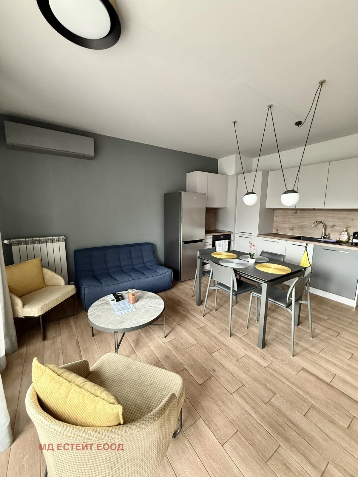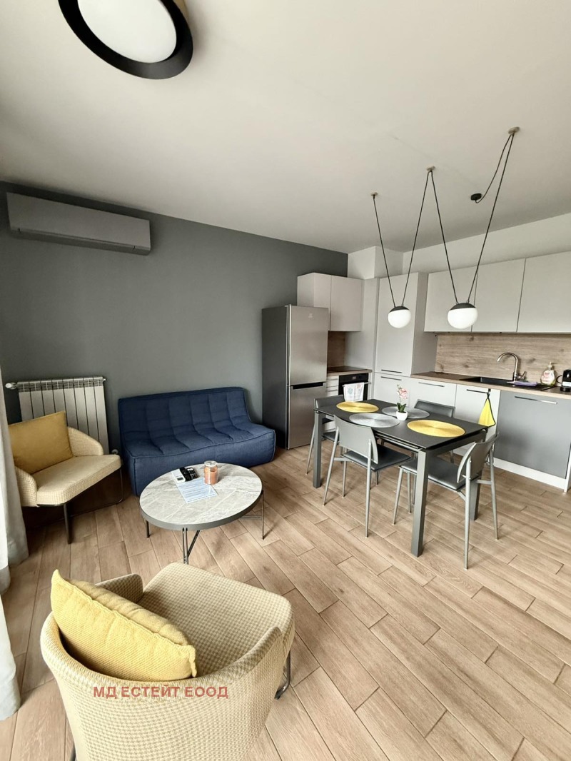МД ЕСТЕЙТ има удоволствието да Ви представи напълно обзаведен, тристаен апартамент под наем. Апартаментът разполага с всичко необходимо за едно домакинство и се състои от просторна всекидневна с кухня, родителска спалня, детска/втора спалня, баня, антре и тераса.Има бърз достъп до бул. Симеоновско шосе, а в близост се намират множество магазини, супермаркети и спирки на градския транспорт. Сградата е с отлични общи части.