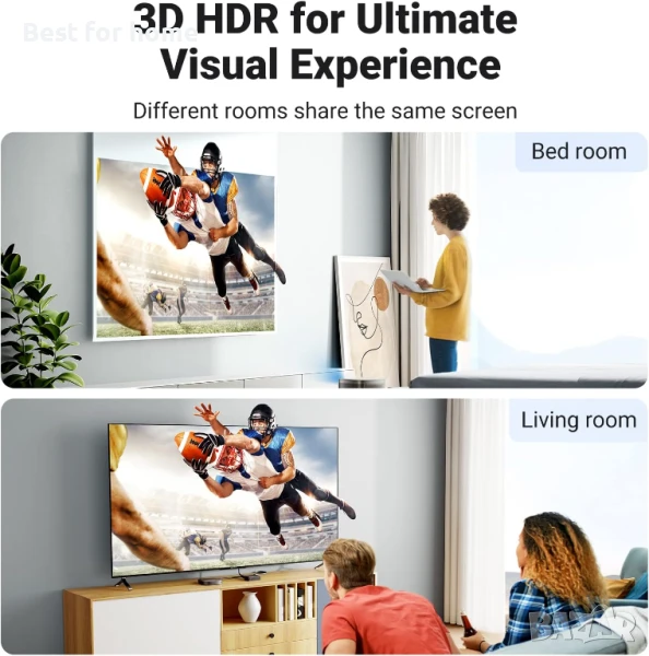 Споделяйте един и същ канал със семейството си: Само с един източник вече можете да се наслаждавате на любимото си съдържание на два телевизора едновременно с минимални затруднения. Дори ако вие и вашето семейство сте в различни стаи, все още можете да споделяте едно и също съдържание помежду си. Двупосочният HDMI разпределител поддържа само дублирано съдържание, без режим на разширяване.