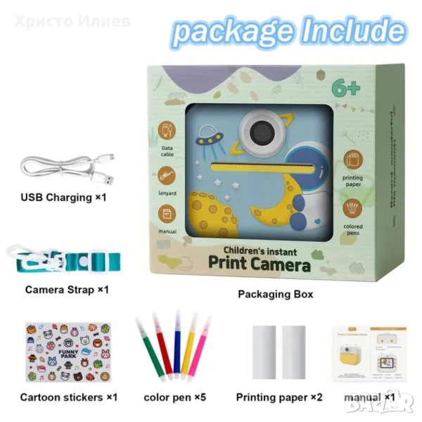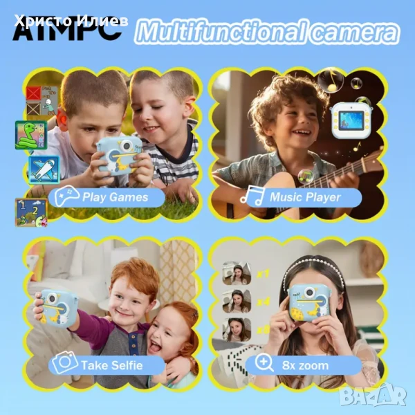 Детски фотоапарат за моментални снимки с принтер и вградени игри
