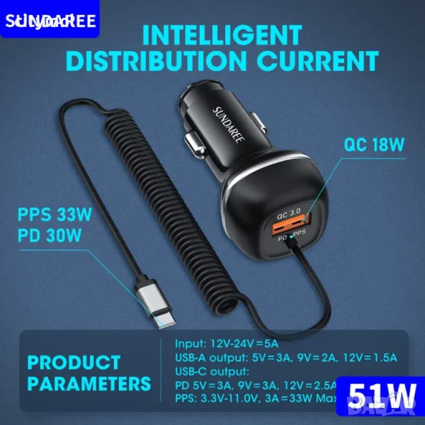 Зарядно за кола бързо зареждане QC 3.0, 1 x USB, 1 x кабел Type-C, дисплей, съвместим с iPhone, Samsung, Huawei и др.
