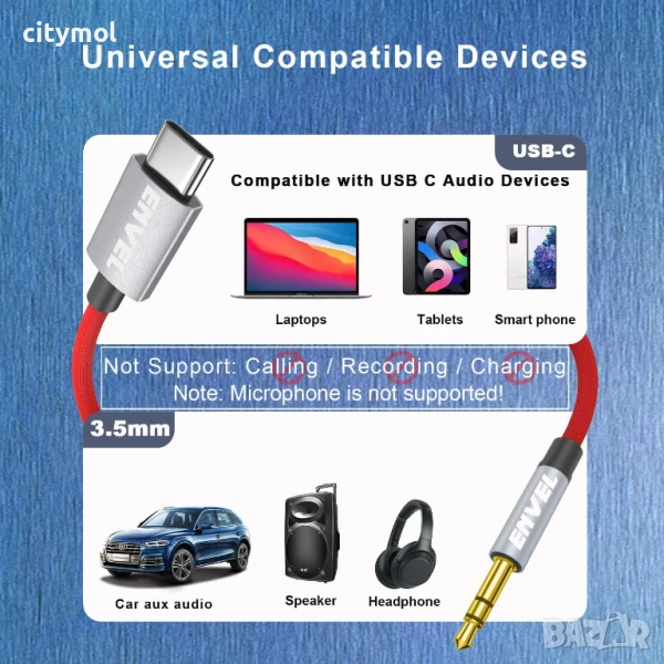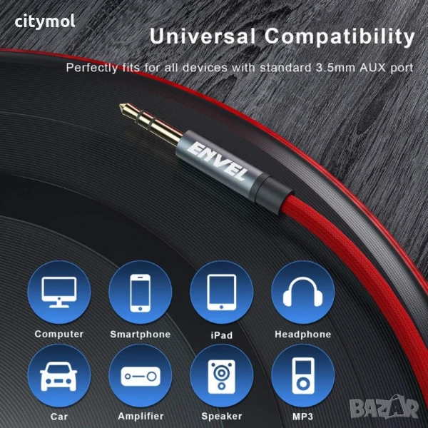 - Перфектно съвместим с всякакви устройства с 3,5 мм aux порт. Като iPhone, iPod, iPad, слушалки, Hi-Fi, автомобилни стереоуредби, таблети, лаптопи, смартфони, MP3 плейъри, високоговорители и всякакви други аудио устройства.