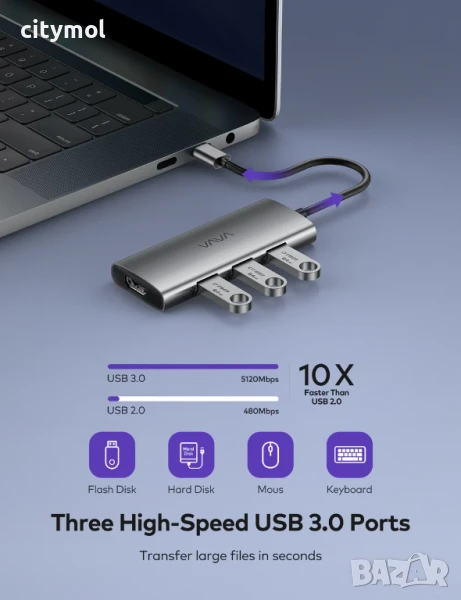 MacBook Pro/iPad Pro/ Type-C лаптопи/ Windows/ macOS. Разширява USB-C порта на вашия лаптоп.