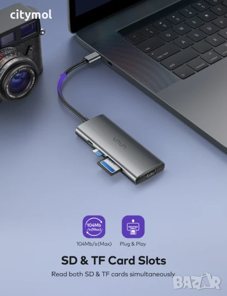 VAVA 7-в-1 USB C хъб с 4K 60Hz HDMI, 3xUSB 3.0, USB C - PD,Micro SD и SD четец на карти