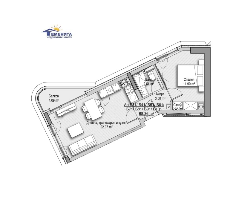 Дневна с трарезария и кухня-22,07 кв.м с балкон-4,09 кв.м