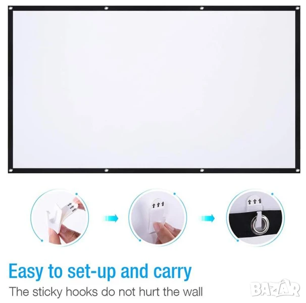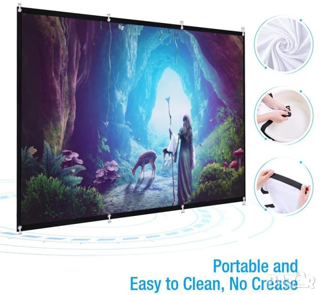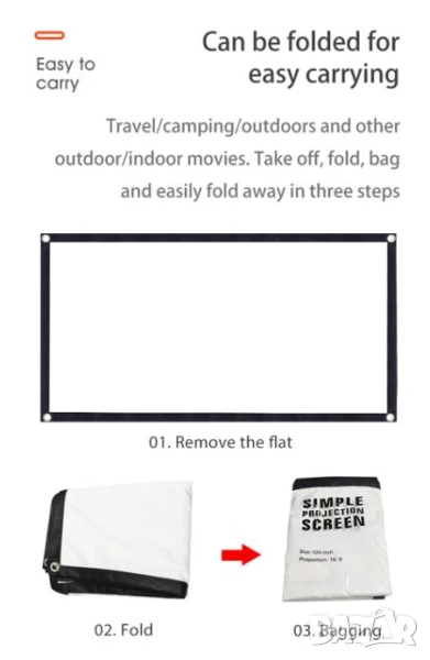 екран за проектор , който ще бъде най-добрият приятел на Вашия проектор! HD 16:9 ОТЛИЧЕН филмов прожекционен екран, изработен от естествена полиестерна тъкан. Никога няма да повярвате, че такъв малък пакет ще се превърне в прожекционен екран, лек и преносим, можете да го сгънете в малък размер и да го носите където пожелаете!