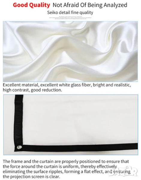„Бръчки, моля, вървете си!“ Не е нужно да се притеснявате за бръчки или гънки, причинени от сгъване на екрана. Окачете го на закрито или на открито, поканете семействата на приятелите си, споделяйки радостното време помежду си. Този филмов екран за проектор е по-ярък от повечето други прожекционни екрани, повърхностно подобрявайки резултатите от изображението. Екрана с висок контраст и материала против намачкване, правят всичко по-лесно. Ако върху него има прах, препоръчва се да го избършете с мокра кърпа.