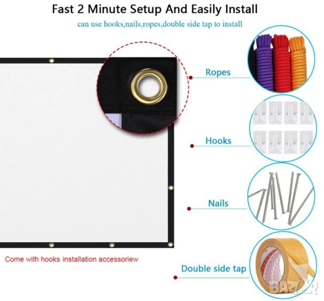 Лесно инсталиране на екрана за проектор, можете да го разгънете и монтирате буквално за минути. Може да бъде окачен на стена с помощта на куки (включени в комплекта). Екранът е подходящ за вътрешна и външна употреба.