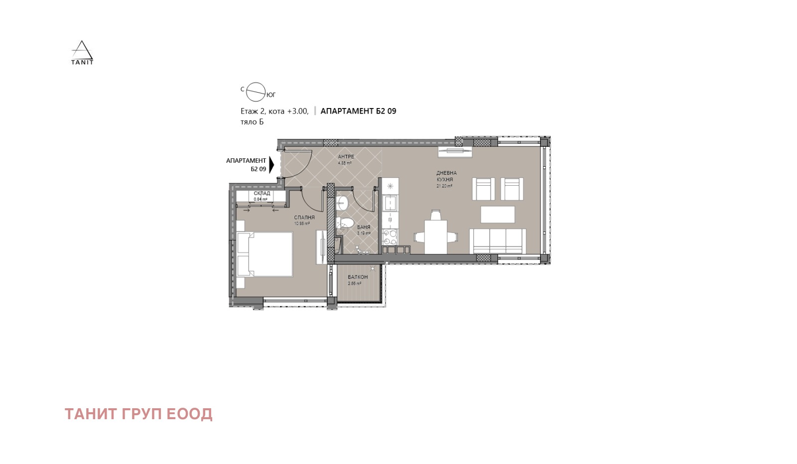 Предлагаме за продажба ап. Б2 09, двустаен, на втори жилищен етаж (кота +3,00м.) със ЗП 53,88 кв.м. (68кв.м. с вкл. общи части и склад от 3кв.м.) със южно изложение в новата ни сграда Lion Hill етап 2. Цената на апартамента е 143 000 евро с вкл. ДДС. В етап 1 и етап 2 все още има избор на едностайни, двустайни, тристайни, четиристайни апартаменти с различни големини и изложения, на различни етажи, както и паркоместа - разгледайте всички свободни обекти на уебсайта ни tanit.bg.