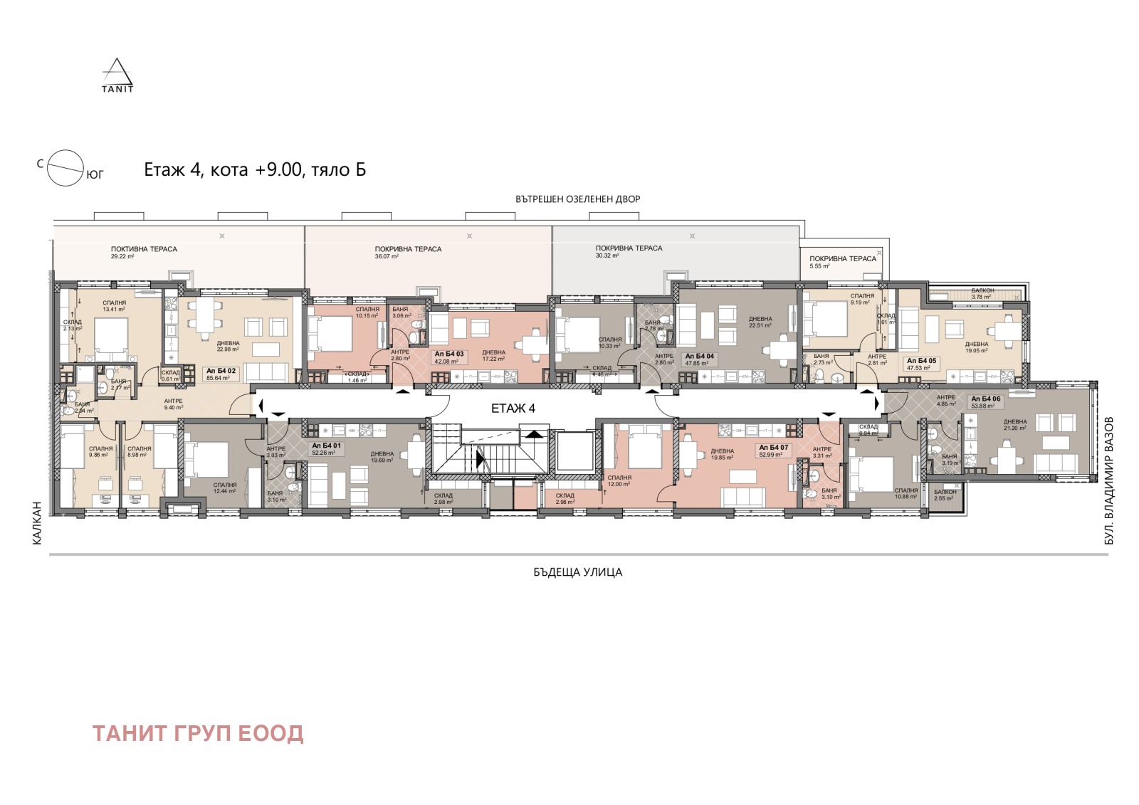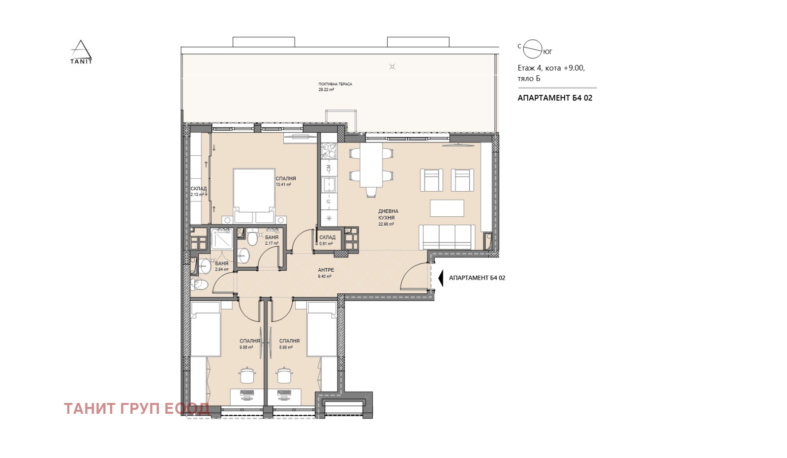 Предлагаме за продажба ап. Б4 02, четиристаен с три отделни спални, на четвърти жилищен етаж (кота +9,00м.) със ЗП 86 кв.м. (135кв.м. с вкл. общи части, покривна тераса от 29кв.м. и склад от 3кв.м.). Изложението на апартамента е източно, като по цялата широчина на източния фронт е разположена прелестната покривна тераса от 29 кв.м. Апартаментът е част от новата ни сграда Lion Hill етап 2. Цената на ап. Б4 02 е 2562 000 евро с вкл. ДДС. Аналогичен апартамент, но без покривна тераса, е свободен и на шести етаж (ап. Б6 02). В етап 1 и етап 2 все още има избор на апартаменти - разгледайте всички свободни обекти на уебсайта ни tanit.bg.