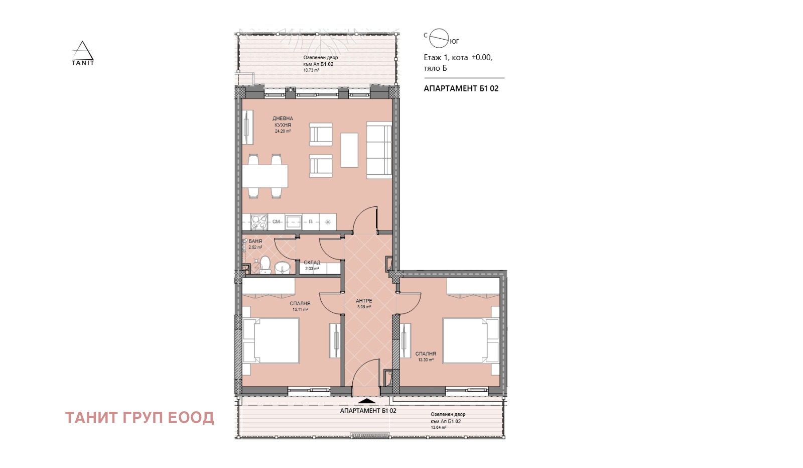 Предлагаме за продажба ап. Б1 02, тристаен, на партера (кота +0,00м.) с РЗП 75 кв.м. (116кв.м. с вкл. общи части, вкл. 24кв.м. двор и 3 кв.м. склад) в сграда Lion Hill етап 2 на цена 210 000 евро. Ап. Б1 02 има отделен вход, директно от тротоара, което му позволява да се използва за офис, стоматологична клиника, лекарски кабинет, фризьорски салон, козметично студио, детски център или др. Свободни са и съседните два апартамента, ап. Б1 01 (РЗП с общи части и тераса 89 кв.м., цена 163 000 евро) и ап. Б1 03 (РЗП с общи части и тераса 108 кв.м., цена 199 000 евро), които биха могли да се обединят с ап. Б1 01, за да се получи по-просторен обект. В съседство на партера на етап 1 ще бъде и новият офис на нашата фирма. В сградата има възможност да се закупят и паркоместа - разгледайте всички свободни обекти на уебсайта ни tanit.bg.