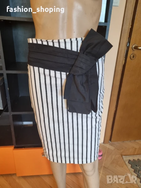 Много ефектна пола, решена в класически десен райе във вечно актуалната комбинация бяло-черно. С красива черна панделка отпред. Подходяша за дами, които предпочитата екстравагантния делови стил. Полата е тип молив, следва извивките на тялото и е много секси. В комбинация с черни обувки/сандали на висок ток или черно-бели сандали и бял тол по тялото би стояла невероятно.