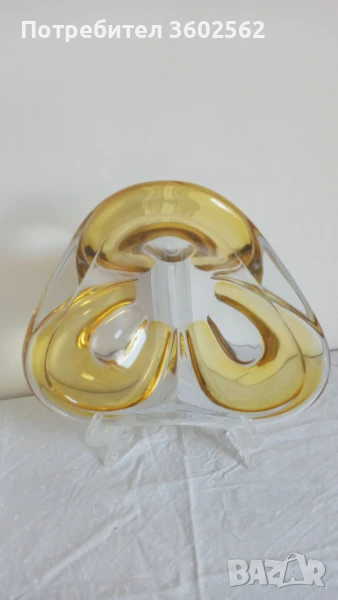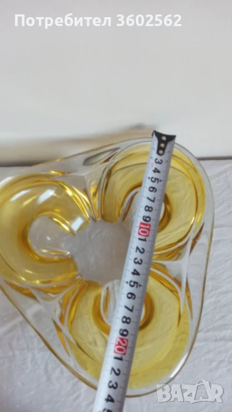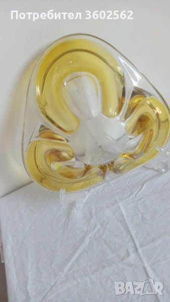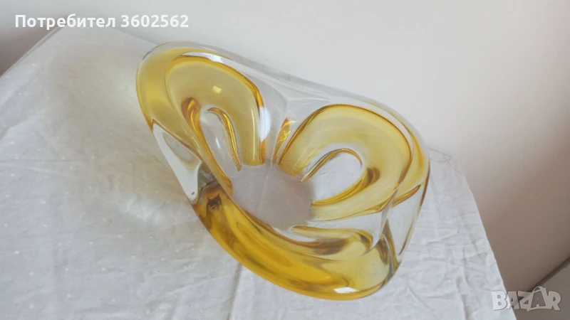 Фруктиера от ръчно духано стъкло в кехлибарен/ златисто- жълт / цвят съчетан с прозрачно стъкло - без дефекти. Тегло 1150 грама и 24 см. в най-широката част